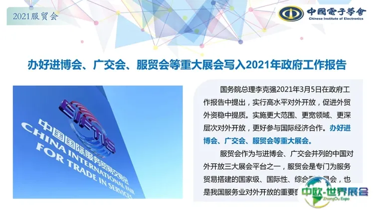 成为国际服务贸易领域传播理念、衔接供需、共享商机、共促发展的重要平台,是全球服务贸易领域规模最大的综合性展会和中国服务贸易领域的龙头展会,同中国进出口商品交易会(广交会)、中国国际进口博览会(进博会)一起成为中国对外开放的三大展会平台。