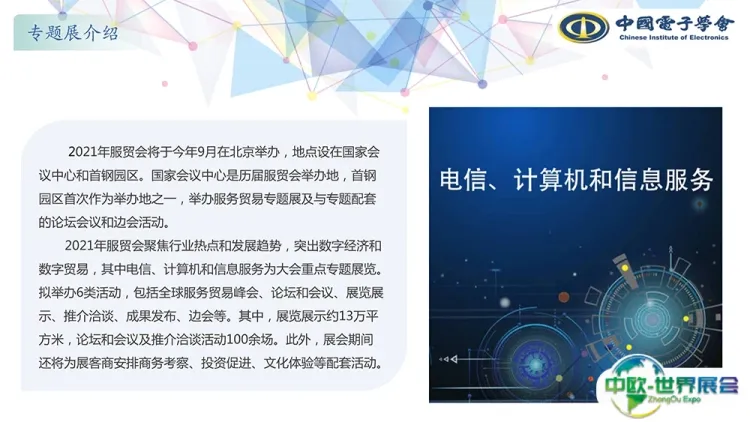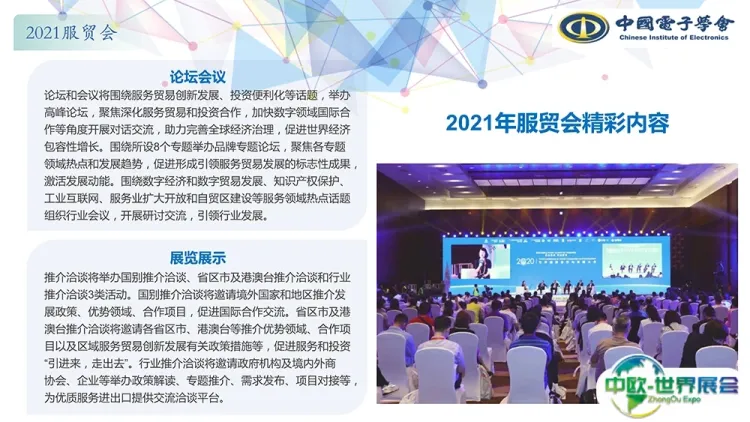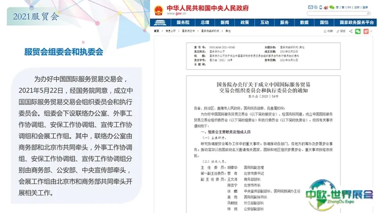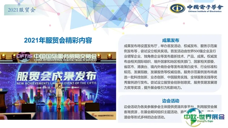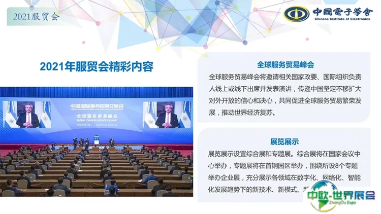 中国国际服务贸易交易会-服贸会2025在线预定展位 中欧国际为您呈现展位图、展位价格、参展商名录、会刊申请、邀请函申请、门票购买、签证服务、展位搭建等。想了解更详细资料,请联系我们~