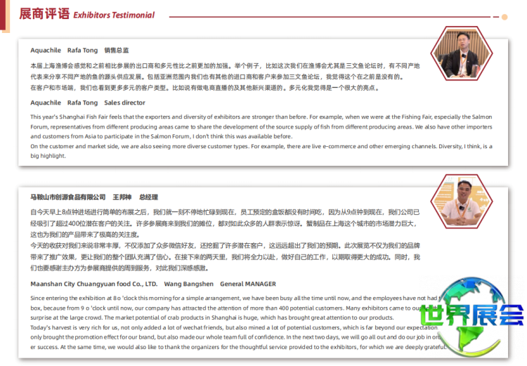 上海渔博会(World Seafood Shanghai)以12万平方米的展览空间,吸引来自美国、阿根廷、俄罗斯、挪威、厄瓜多尔、澳大利亚、西班牙、韩国、越南、泰国、马来西亚等30余个国家的3000多家参展企业,展示上万种优质水产品及创新成果,预计将迎来全球近百个国家与地区超过十万人次的专业观众参与盛会。