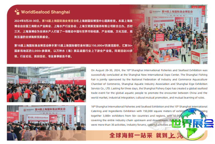 上海国际渔业展(World Seafood Shanghai)与上海国际餐饮食材展同期举行,整合水产与餐饮核心资源及行业动向,以市场供需为指引,紧跟产业发展,打造集水产海鲜、加工生产、渔业服务、水产养殖于一体的综合性全球水产商业平台,协助企业开辟国际贸易新机遇。