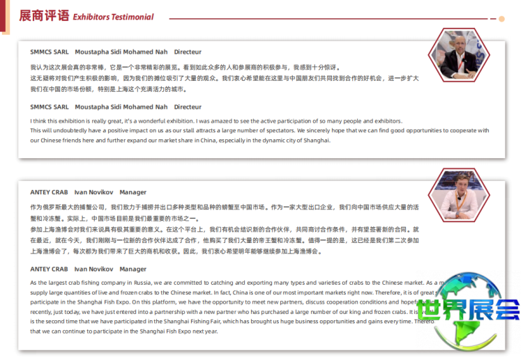 上海渔博会(World Seafood Shanghai)以12万平方米的展览面积,吸引来自美国、阿根廷、俄罗斯、挪威、厄瓜多尔、澳大利亚、西班牙、韩国、越南、泰国、马来西亚等30多个国家和地区的超3000家展商参展,展示上万种优质水产品及创新成果,预计将迎来全球近百个国家与地区超过十万人次的专业观众参与。