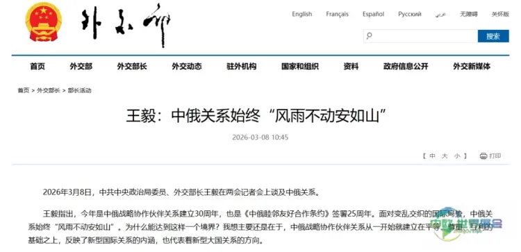 3月8日,中共中央政治局委员兼外交部长王毅在全国两会期间的记者会上就中俄关系发表看法。他强调,今年正值中俄建立战略协作伙伴关系三十周年,同时也是《中俄睦邻友好合作条约》签订二十五周年。在国际形势复杂多变的背景下,中俄双边关系始终展现出“坚如磐石”的稳定性。