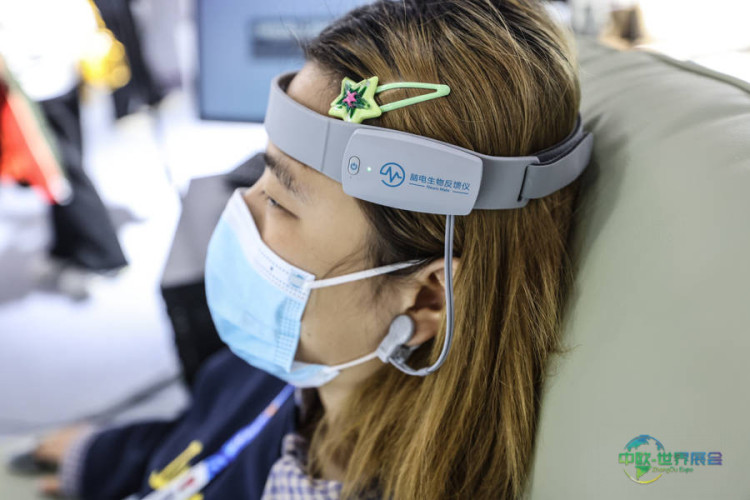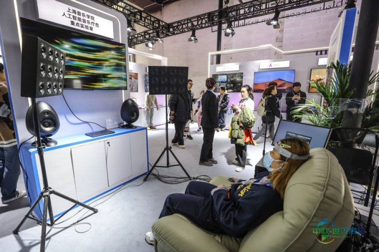 图中显示,上海音乐学院人工智能音乐疗愈重点实验室在本届展会上展示了一套数字音乐疗愈系统。使用者佩戴轻巧的脑电采集设备,几分钟后即可获得身体状态数据。随后,人工智能模型会如同一位资深疗愈师,解析这些数据背后的身心需求,并运用AI算法进行即时分析与状态评估,自动生成与之匹配的疗愈音乐。用户在沉浸式环境中体验实时定制的疗愈方案,系统通过持续监测动态调整方案,形成一个完整的疗愈闭环。