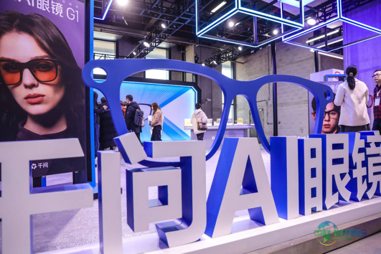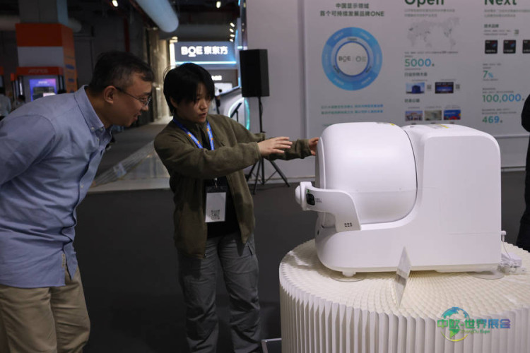 图中显示,在小度展台,技术人员正在对一款小度AI眼镜Pro产品进行调试。