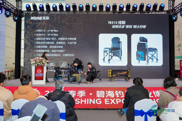 与此同时,骑士钓椅体验区不断有钓友前来试坐交流。戎鞍·骑士钓椅的设计聚焦于长时间坐钓的舒适承托、方便收纳、以及“智轨”系统带来的高效拓展。该产品采用铝镁合金主体结构,集成“智轨”系统,配备马鞍型座面与可调节腰靠,并附有多功能后挂袋。此外,配合自适应弹射支脚可迅速调整以适应不同坡面。现场钓友评价,这款钓椅在舒适度、功能性与环境适应性方面达到了很好的统一。