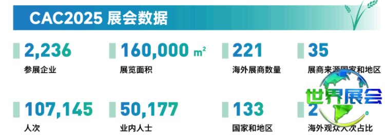 中国上海国际农用化学品及植保展览会(CAC)上一届展会总面积达80000平方米,1475家参展企业分别来自俄罗斯、中国台湾、美国、巴西、泰国、印尼、印度、德国、澳大利亚等国家和地区,吸引观众45000人。展会期间设立的海外展团推介区以及肥料新产品新技术发布区,现场人气持续高涨。