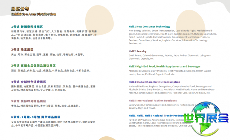 6号馆、7号馆、8号馆、国货潮品展区:全国各省区市及新疆生产建设兵团展团、地方代表性品牌企业、国内大型企业、中华老字号产品、中国原创潮流品牌