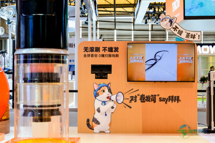 步入友望展台,相较于冷冰冰的参数展示墙,展区内取而代之的是“家居场景”、“细节博物馆”等精心设计,展示真实用户关于清洁痛点的留言;除螨仪区域配备了尘螨显微镜观察设备,让参观者亲眼目睹微观世界;吸尘器区设置了“零缠发挑战”,邀请观众测试超长头发是否会被缠绕。
