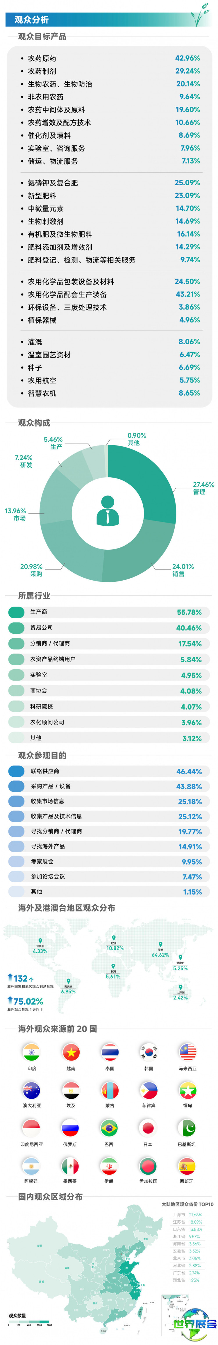 中国上海国际农用化学品及植保展览会(CAC)上届展会总面积达80000平方米,1475家参展商分别来自俄罗斯、中国台湾、美国、巴西、泰国、印尼、印度、德国、澳大利亚等国家和地区,吸引观众45000人次。展会期间设立的海外展团推介专区以及肥料新产品新技术发布区,现场人气极为火爆。