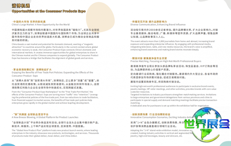 消博会将贯彻中央关于促进消费的相关部署,持续秉持“高端精品”导向,汇集海内外优质消费品资源与全球采购商、供应商,致力于将消博会建设成为优化消费供给、疏通消费渠道、增强消费信心、推动国内国际双循环的全球消费精品展示交易平台,为跨国企业共享中国市场及本土企业迈向世界创造商机。