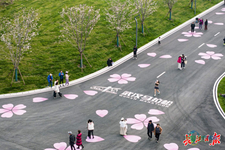 “欢迎全球各地的朋友来武汉参加马拉松……”3月18日黄昏,青山江滩汉马终点处,市民叶女士站在樱花点缀的跑道上,录制短视频热情欢迎外地参赛者。