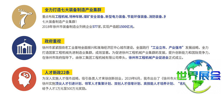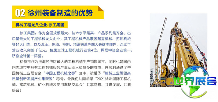 徐州国际工程机械博览会(CHINA XUZHOU)将全面呈现工程机械、建筑机械、矿业机械、施工机械、商用车辆、应急设备等各类产品,着重打造品牌展示、工程采购、技术研讨、政策对接四大功能平台。进一步推动行业进步,开拓新兴市场,为政府与市场搭建集投资、建设、运营于一体的综合服务桥梁,从而提升品牌知名度、企业经济活力与行业持续发展能力。装备制造业是徐州的核心产业,而智能制造对装备制造业的升级转型起着关键作用。