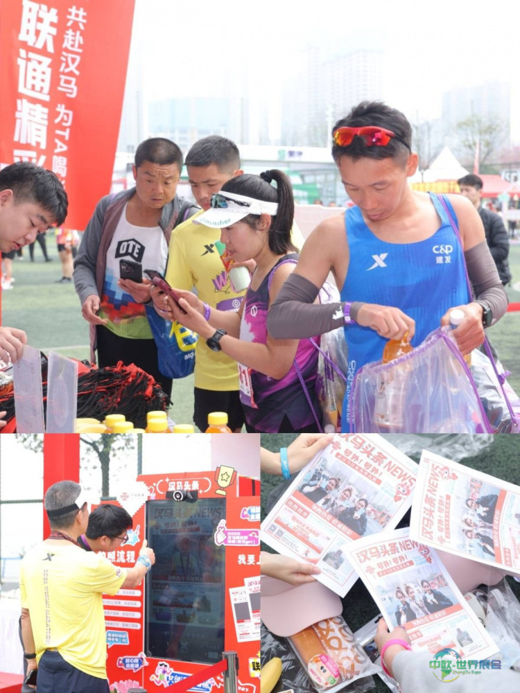 赛前于武汉马拉松博览会,清凉擦汗巾、专业肌肉贴、便捷收纳包等实用物品陈列有序,跑者们依次领取,满怀信心与愉悦地准备比赛。
