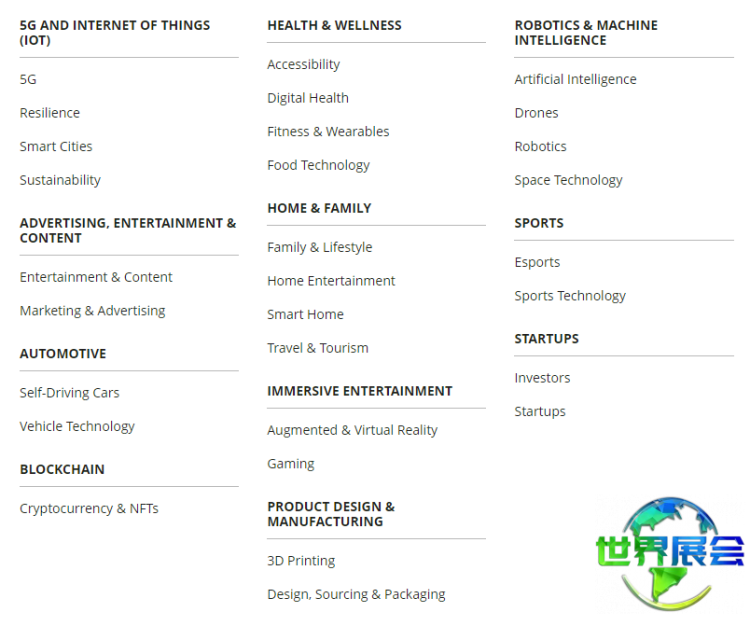 其他展区:节能环保新技术、新能源产品等;智能家居、3D打印产品、无人系统、游戏类电子产品、可穿戴设备、传感器、机器人、健康与健身相关电子产品、运动类电子产品