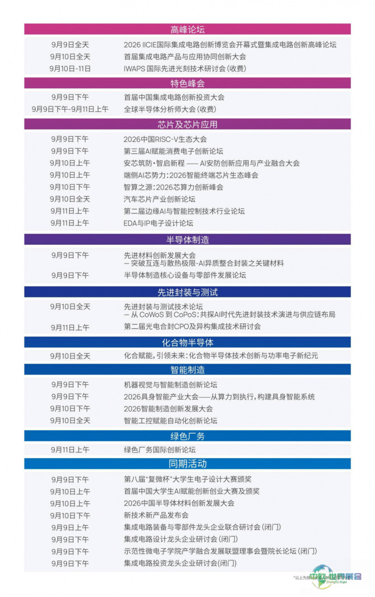 展会汇聚全球集成电路领域极具影响力的专家学者及产业链龙头企业,聚焦半导体制造、装备材料、先进封装、CPO光电合封、化合物半导体、机器视觉与智能制造、绿色厂务等关键领域,探讨突破核心技术瓶颈;同时围绕人工智能芯片、RISC‑V、智能汽车、消费电子、安防、存储芯片等应用场景,搭建芯片技术与终端需求的高效对接平台,促进产学研用深度融合。