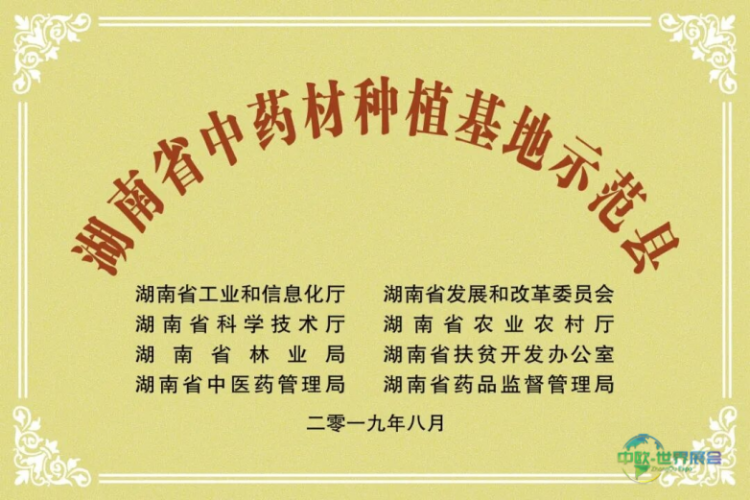 2019年8月,湖南省工业和信息化厅、省发展和改革委员会等八部门联合认定安化县为“湖南省中药材种植基地示范县”。