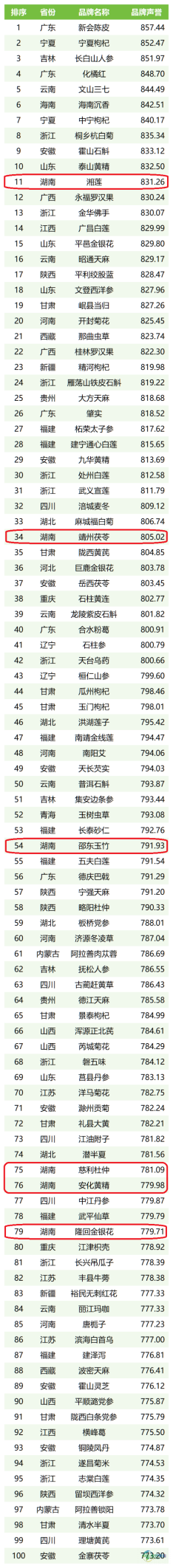 在“2024中国地理标志农产品(中药材)区域公用品牌声誉TOP100”榜单中,湖南省的湘莲(位列第11)、靖州茯苓(位列第34)、邵东玉竹(位列第54)、慈利杜仲(位列第75)、安化黄精(位列第76)、隆回金银花(位列第79)均成功入选。同时,龙山百合、隆回龙牙百合等进入了地理标志农产品(蔬菜)区域公用品牌声誉百强榜;汉寿甲鱼等入选地理标志农产品(水产)区域公用品牌声誉百强榜;张家界莓茶等则跻身地理标志农产品(茶叶)区域公用品牌声誉百强榜。