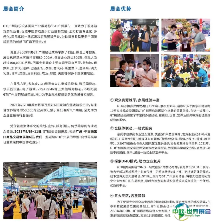 广州游乐设备国际产业展-神州游乐展(GTI)诞生于2009年,一直致力于服务游乐行业、助力行业发展。GTI广州展锁定专业领域,致力于打造一个集专业性、综合性和国际性于一体的B2B展贸平台。