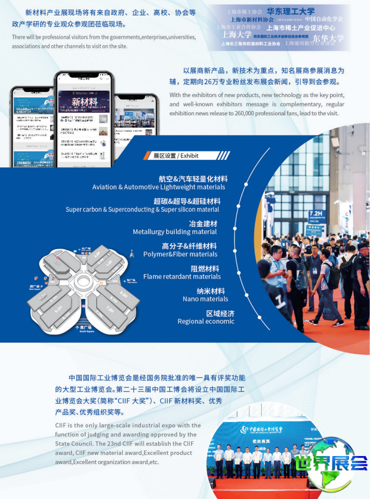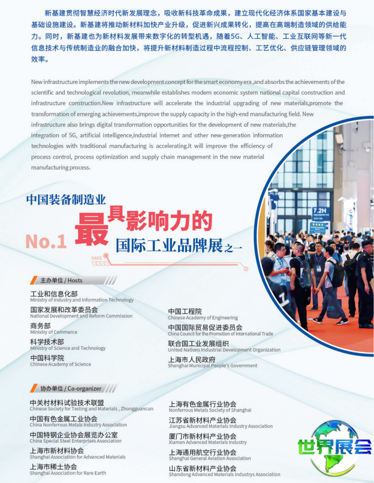 上海国际新材料产业展NMIS将充分依托中国工博会在先进装备制造领域的平台资源,融合石油化工、机器人、信息技术、新能源、汽车、航空航天、轨道交通、船舶制造、国防军工等产业链上下游要素,汇聚全球材料领军企业,集中呈现前沿材料技术在高端装备制造领域的应用成就,构建一个全球材料产业应用创新平台。