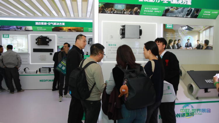 绿岛风的各个场景展区吸引了众多参观者停留观看。其中,吊顶式热回收新风机作为亮点产品之一,能够高效满足酒店大堂、会议厅及客房等场景的通风换气与能源利用需要,在实现空气多重净化和均衡送风的同时,提高了整体能源使用效率,达成了节能与实用的双重目标。