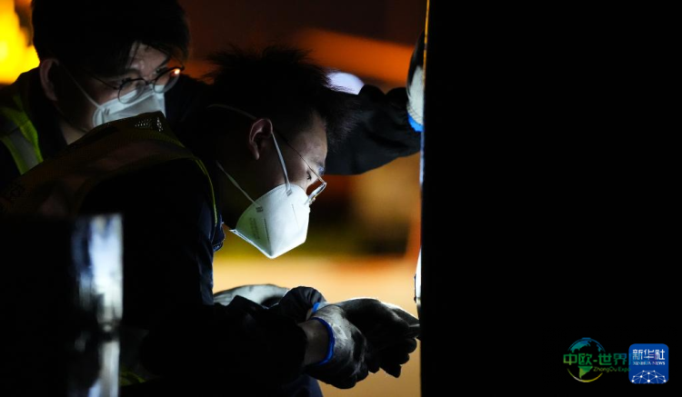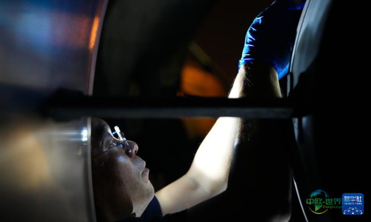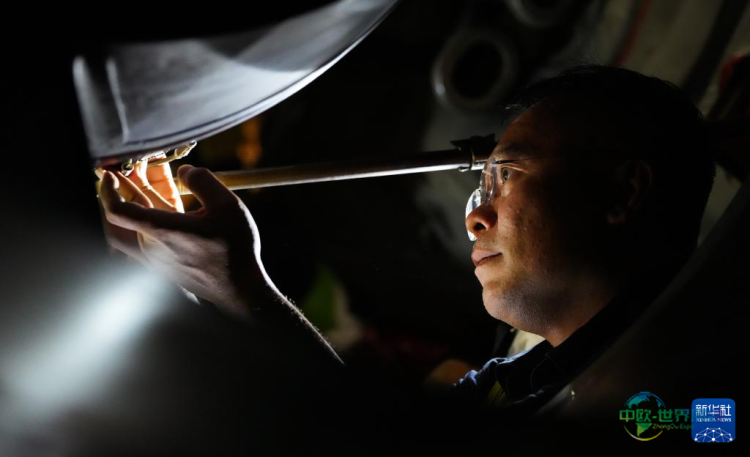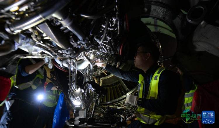 在海口美兰国际机场的停机坪上,南方航空工程技术分公司的机务工程师们正对“消博号”彩绘飞机执行细致的检查工作(摄于4月4日)。
