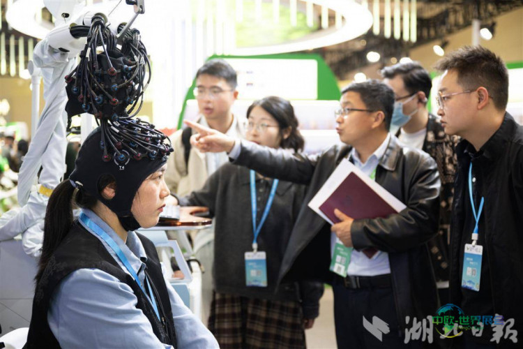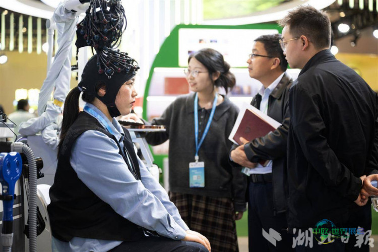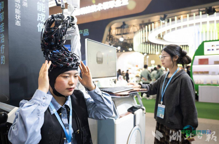 4月8日,武汉依瑞德展示的非侵入式脑机接口——近红外脑功能成像系统吸引了大量观众。(湖北日报全媒记者 任勇 魏铼 摄)