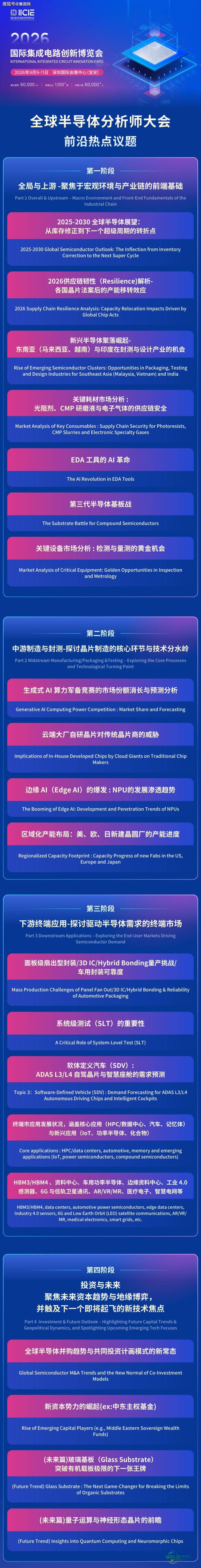 本届全球半导体分析师大会第三部分“下游终端应用”专场,凭借IICIE国际集成电路创新博览会所拥有的全产业链资源,不仅是一场汇聚全球顶尖智慧的专业研讨会,更是一次高效的资源对接盛会。参会者将有机会与全球顶级分析师及行业专家进行面对面交流,精准把握半导体下游终端应用领域的发展机遇,破解企业面临的现实难题,对接半导体与下游终端产业的核心资源,从而推动双方协同创新、共同发展,助力产业链下游实现高质量升级,并带动半导体产业持续走向复苏。