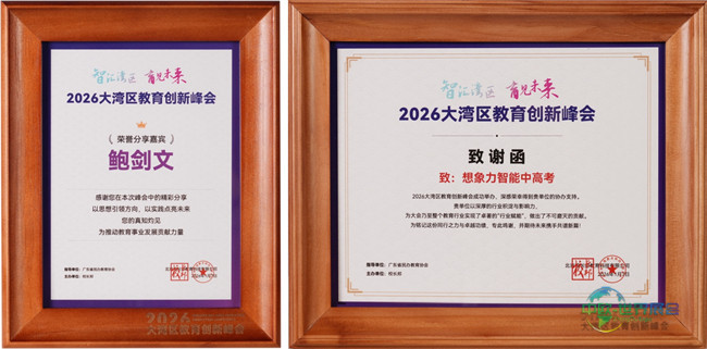 近期,2026年大湾区教育创新峰会暨第二十五届T-LINK教育博览会在广州隆重开幕。作为国内AI结合中高考提分领域的领军品牌,想象力智能中高考依托扎实的产品能力、业内领先的提分成效以及广泛的影响力,成功获得峰会授予的「优选参展品牌」重要认证,并收到主办方发出的官方感谢信。品牌创始人鲍剑文先生被授予峰会荣誉分享嘉宾称号。三项荣誉齐聚,充分展现了其在行业内的标杆地位与权威认同。