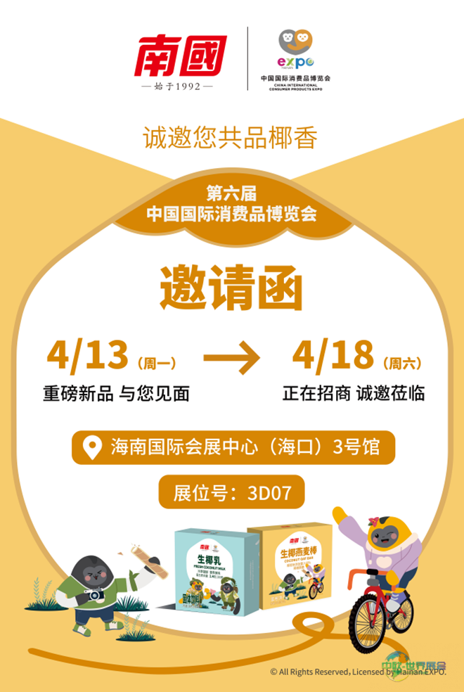 4月13日至18日,第六届中国国际消费品博览会将于海南国际会展中心隆重开幕。南国食品已准备就绪,将携全新产品阵容与专属优惠活动,在3号馆及登陆大厅,恭候各位新老朋友与合作伙伴的光临!