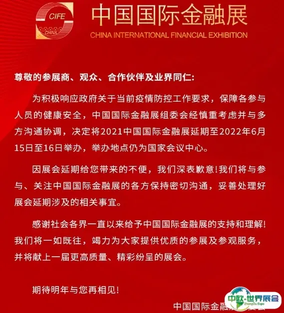 关于2021中国国际金融展延期举办的通知、部分知名展商