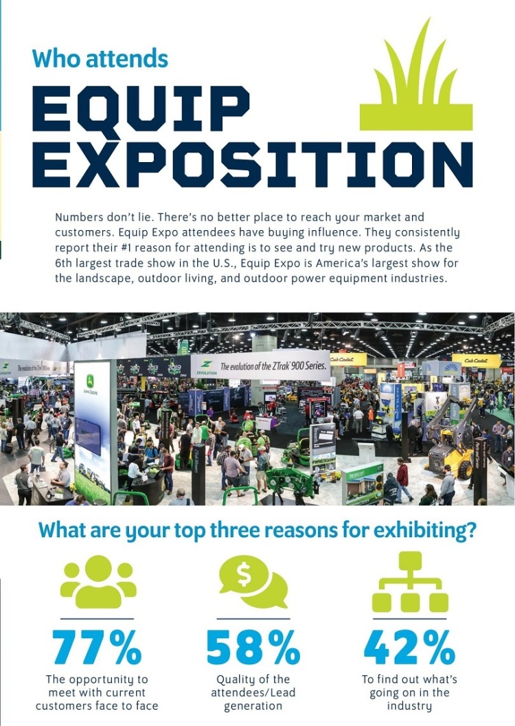 美国路易斯维尔园林机械展览会(equip exposition)以促进中小企业和一流的企业进行交流,以及鼓励创新为主题,展示园林绿色工业领域的产品、设备及新技术、新项目。并通过行业发展研讨会,给业内人士提供一个交流学习、合作、洽淡贸易的机会。不仅提供了参展企业展示企业形象及产品品牌形象的平台,也力求给不同需求的客户提供了商机。