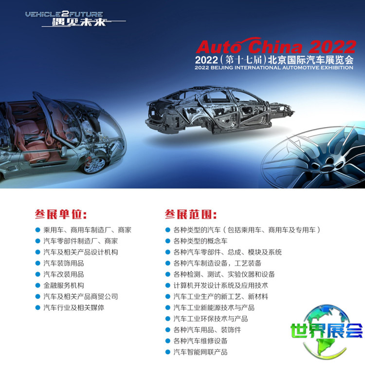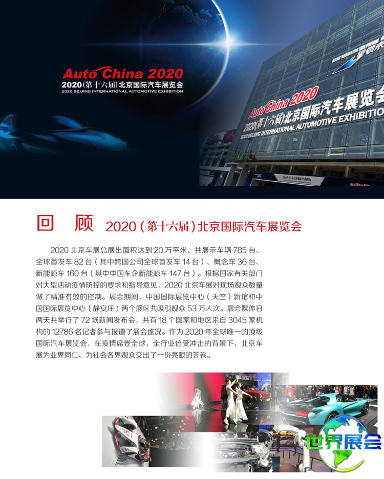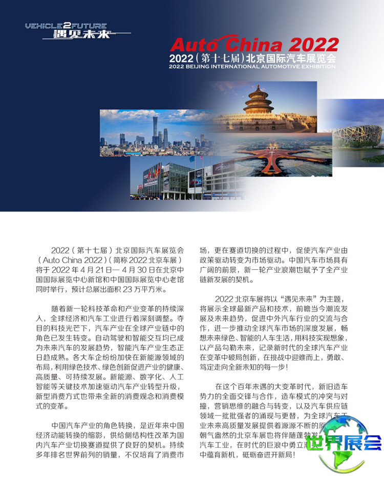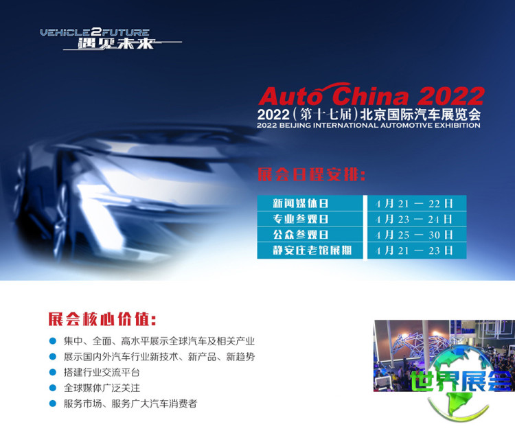 北京国际汽车展览会-北京车展(Auto China)将以中国庞大的汽车市场及与世界汽车工业协同发展的中国汽车产业的进步与创新为依托,联合国内外汽车行业伙伴,共同推动中外汽车业的交流与协作。