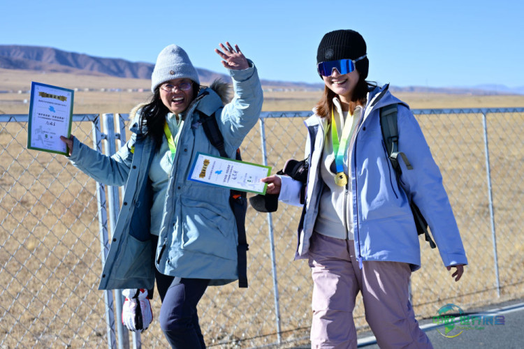 青海湖两位徒步爱好者成功抵达徒步活动终点。新华社记者 齐芷玥 摄