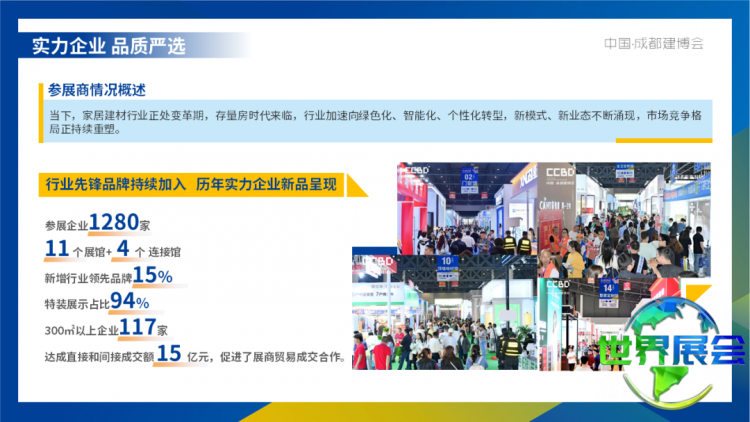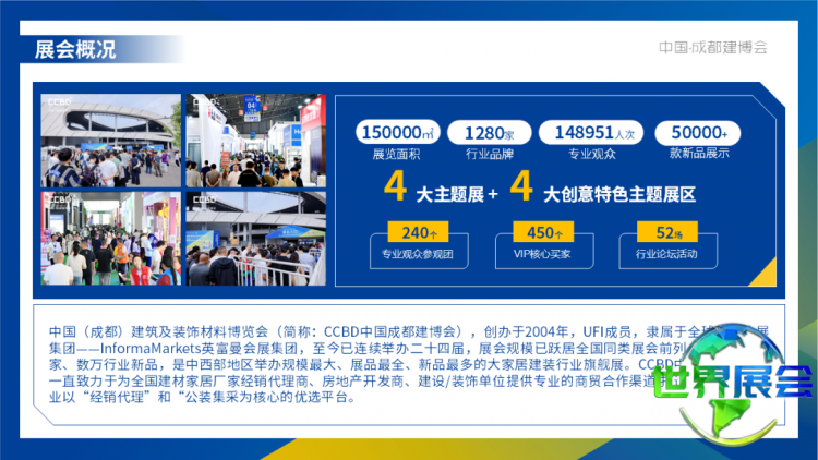 中国(成都)建筑及装饰材料博览会(简称:CCBD中国成都建博会)始于2004年,是获得全球展览业协会(UFI)认证的展会,其规模在中西部同类展会中持续位居首位。CCBD中国成都建博会始终专注于为全国建材家居生产企业、经销商代理商、房地产开发商、建设与装饰单位构建专业的商业合作桥梁,核心聚焦“经销代理”与“公装集采”两大板块,并同步开拓“旧房改造”与“海外贸易”等新兴业务领域。紧抓成渝地区双城经济圈建设的战略契机,凭借成渝区域的产业集聚优势,于2023年在重庆成功创办CCBD中国重庆建博会,形成了“成都四月、重庆十月”双城联动的崭新格局,平台资源整合能力进一步增强。