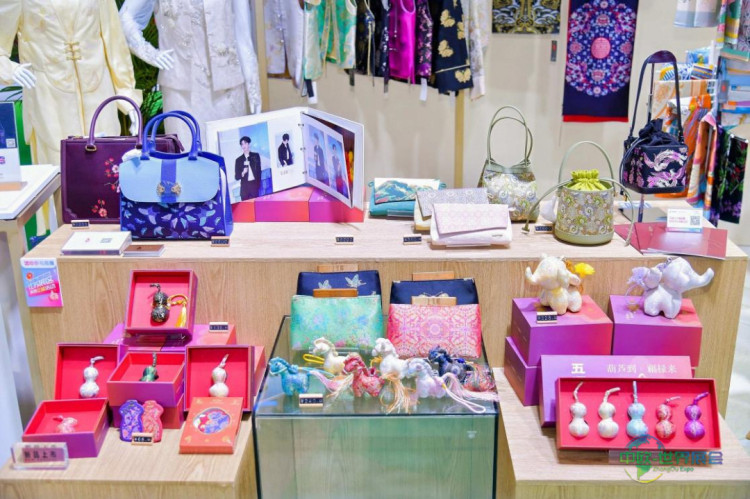在苏州龙泉禧里丝绸科技有限公司的展位,非遗技艺制作的盘扣、真丝方巾、新中式风格斜挎包等日常用品精巧别致,苏绣旗袍则显得雍容华贵。“今年我们与桃花坞木版年画进行了联名合作,从文物中提取传统图案元素,将东方美学的精华融入服装、文化创意等产品的设计之中,开启一场穿越历史的艺术对话。”公司董事长黄秋停介绍道。