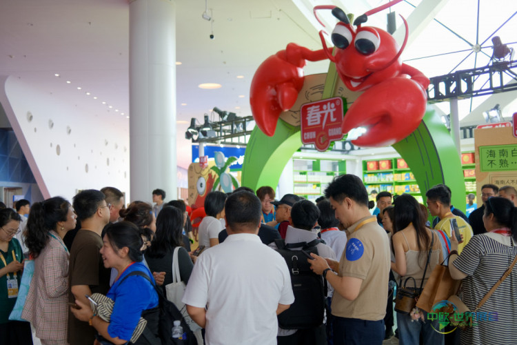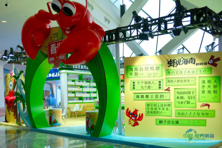 步入展会登陆大厅,春光食品展台门头的巨型龙虾造型便成为全场焦点。展台巧妙结合当前“OpenClaw”龙虾热门话题,将龙虾元素与海浪、椰树等海南标志性景致相融合,以椰绿色为主调、虾红色作点缀,配合“抱一xia吧”互动设施及“虾说”海南翻转墙,塑造出既具识别度又易于传播的展台形象,现场围观拍照的人气持续不减。