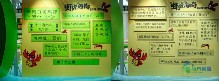 其中,“虾说”海南翻转墙成为现场人气极高的互动打卡点,吸引了大量参观者停留拍照。该装置以“正话反说”这种受年轻人喜爱的方式,围绕大众对海南的了解和疑问进行知识普及:“椰奶是椰子水加了牛奶”对应“椰肉榨汁天生就白!不用加奶”,“海南的椰子水甜,是因为加了糖”对应“北纬18度的阳光雨露是海南椰子水的自动加糖机”,一系列趣味内容涵盖了饮食、气候、人文等多个方面,不仅以轻松互动的方式传播了椰子相关知识,更有效打破了人们对海南的某些刻板印象,实现了文化推广与趣味体验的双重效果。