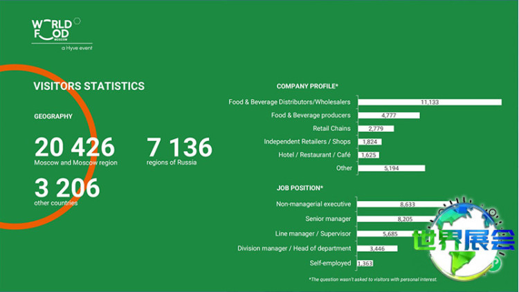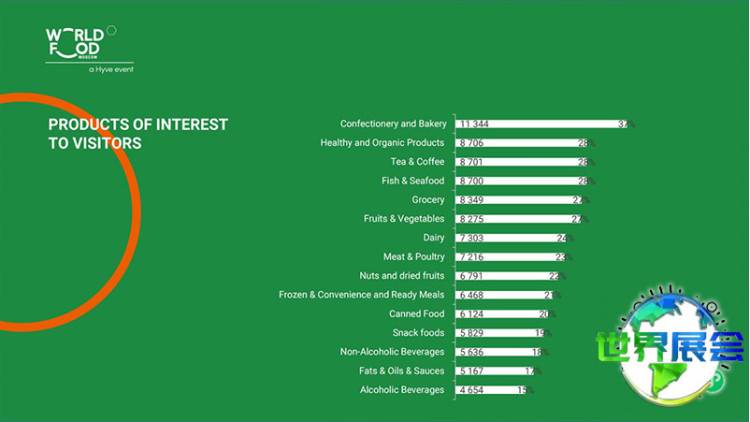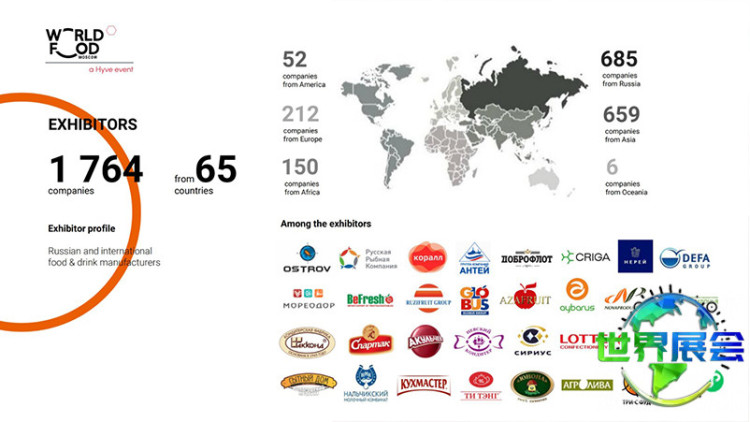 上一届俄罗斯莫斯科国际食品展览会(WorldFood Moscow)总展出面积达58000平方米,吸引了来自中国大陆、中国台湾地区、白俄罗斯、波兰、瑞士、新加坡、日本、韩国、德国、意大利、西班牙等地的1250家企业参展,接待专业观众32000名。