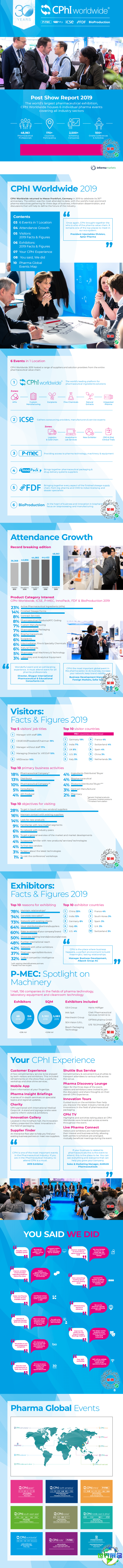 世界制药原料展览会(CPhI)上一届展出总面积达16万平方米,汇聚了2500家参展企业,分别来自中国、美国、中国香港、迪拜、印度、土耳其、澳大利亚、新加坡、日本等地,吸引了4.2万名专业观众。其中中国参展团达650家企业,取得了非常好的反响。