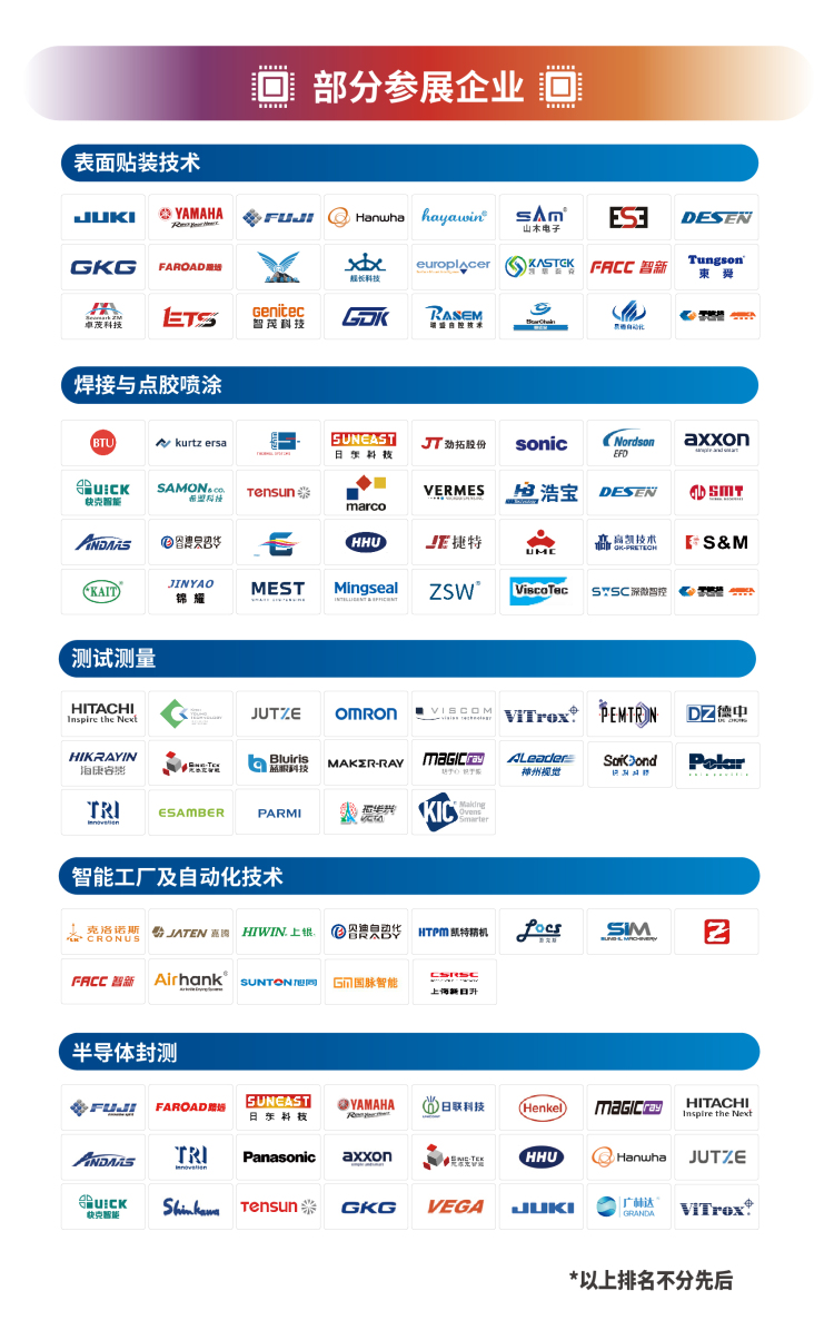 表面贴装:贴装技术和设备、焊接设备、测试与测量设备、实验室测试测量设备、PCBA段测试测量设备、成品组装段测试测量设备、点胶、喷涂设备、电子材料&防静电、电子制造服务、其他表面贴装技术、硬板、软板、软硬结合板、线路板化学品、线路板原材料、线路板专用设备、包装设备、PCB自动化设备、环保处理设备