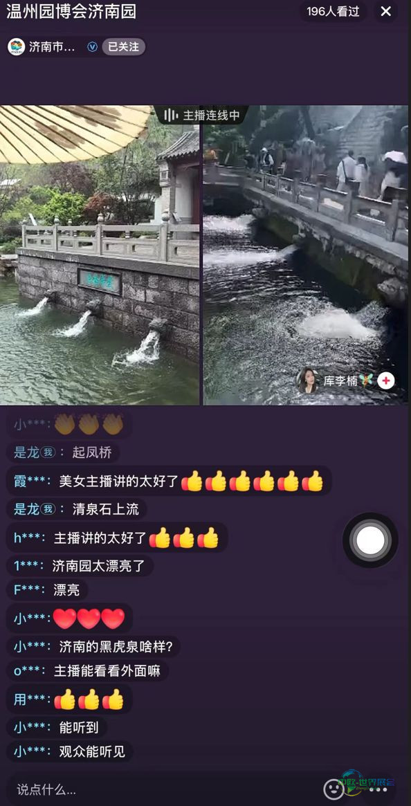 开幕当天启动的泉水实景直播连线活动,成为济南园最引人注目的亮点。直播间里,一边是济南园精心复现的“黑虎啸月”“溪亭泉”“月牙飞瀑”等经典泉景,移步换景,构思巧妙;另一边则实时连线济南本地的泉水与街巷实况,生动展现了泉水喷涌、市民在泉边休憩的鲜活生活图景。一镜连接两地,实现了温州济南园与泉城实景的跨时空对话与融合,让现场游客无需远行,便能沉浸式体验济南“众泉汇流、穿城绕郭”的独特城市景观。