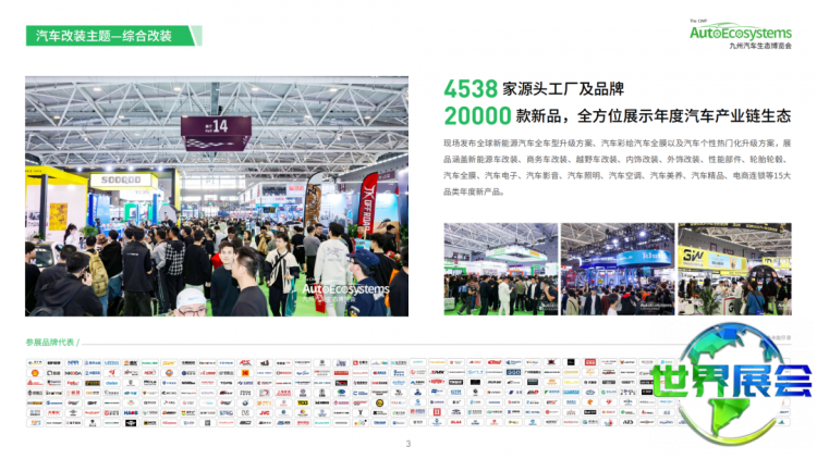 深圳汽车用品、改装配件及汽配展览会(英文简称AUTOECOSYSTEMS,中文名九州汽车生态博览会)是亚洲地区唯一一个整合了“新车发布、前装配套、后装服务、汽车文化”的全产业链汽车生态展示与贸易平台。该展会始于2006年,于2010年步入成熟阶段,并在2020年实现全面升级。九州汽车生态博览会所打造的一站式B2B2C汽车展贸体系,助力参展企业贯通国内市场并链接全球商机。