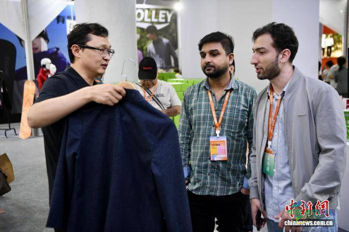 4月18日,第二十八届海峡两岸纺织服装博览会暨全球男装供应链展在福建石狮举行。图为海外采购商在展馆内进行业务接洽。中新社记者 王东明 摄