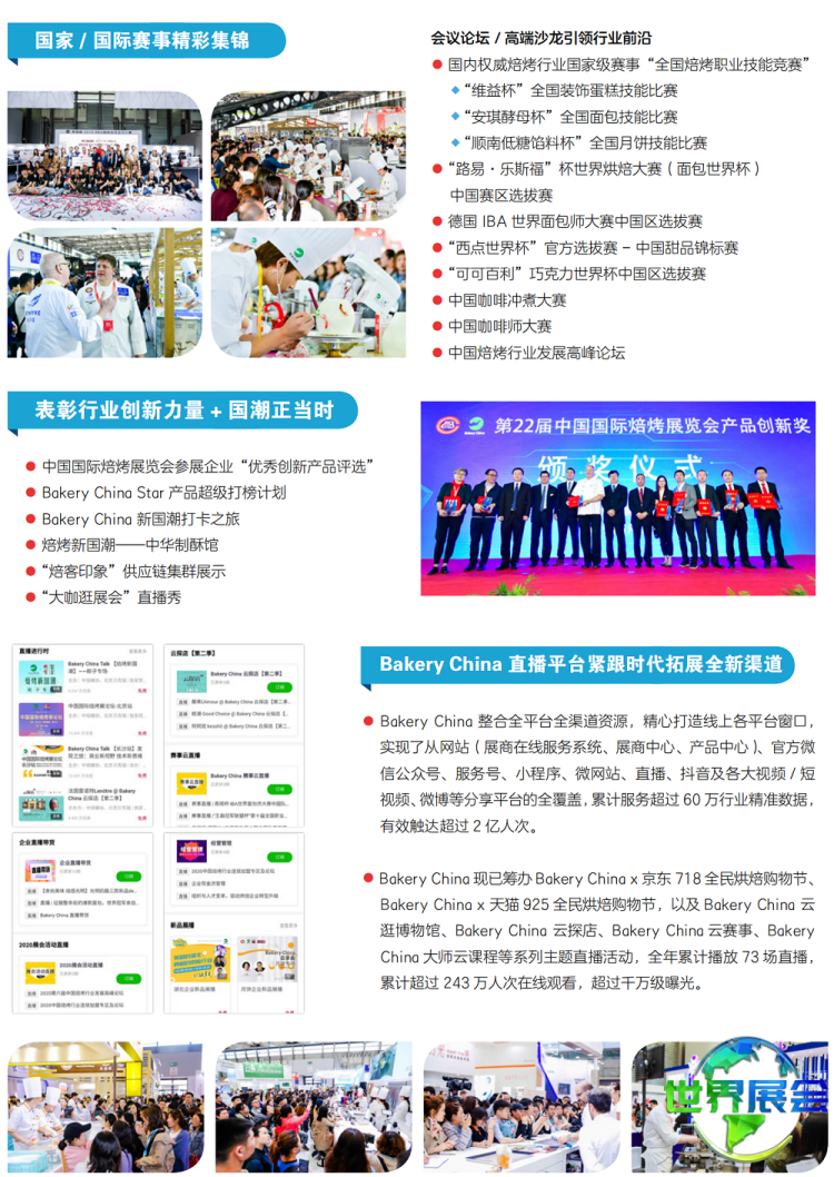中国上海国际焙烤展览会(Bakery China)是全球最具规模的焙烤行业专业展会。自1997年创办以来,已成为服务焙烤全产业链的亚太地区重要国际商贸平台,也是全球规模领先的焙烤产品与服务展览盛会。该展会为全球烘焙领域的领导者、专业人士及从业者提供了交流创新理念的舞台,为推动烘焙行业在研发、生产、销售及相关服务环节的进步提供助力,促进中国焙烤糖制品产业的整体发展。
