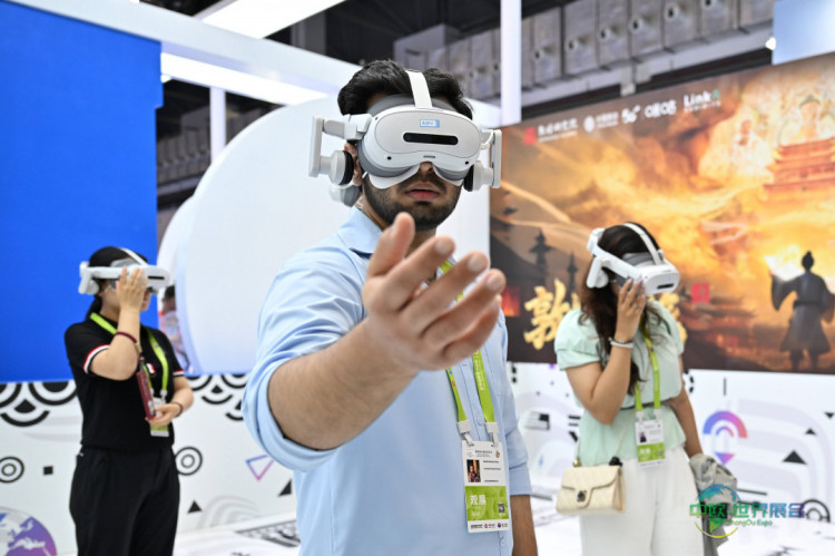 新华社发布图片新闻,北京,2026年4月18日 4月13日,在海南举行的第六届中国国际消费品博览会上,参观者正在体验一款虚拟现实设备。 新华社记者 郭程 摄影