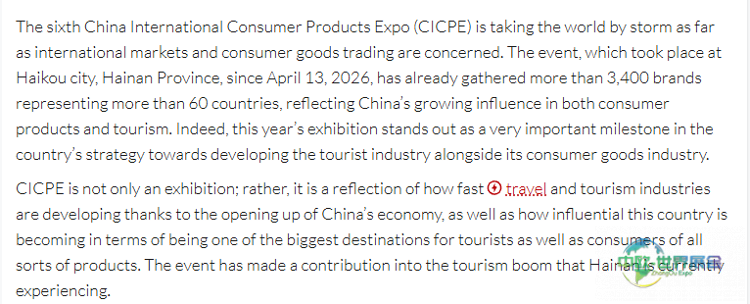 美国《旅行与旅游世界》杂志近期发布报道,重点关注了4月13日至18日于海南举办的第六届中国国际消费品博览会。