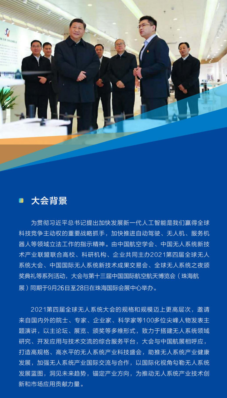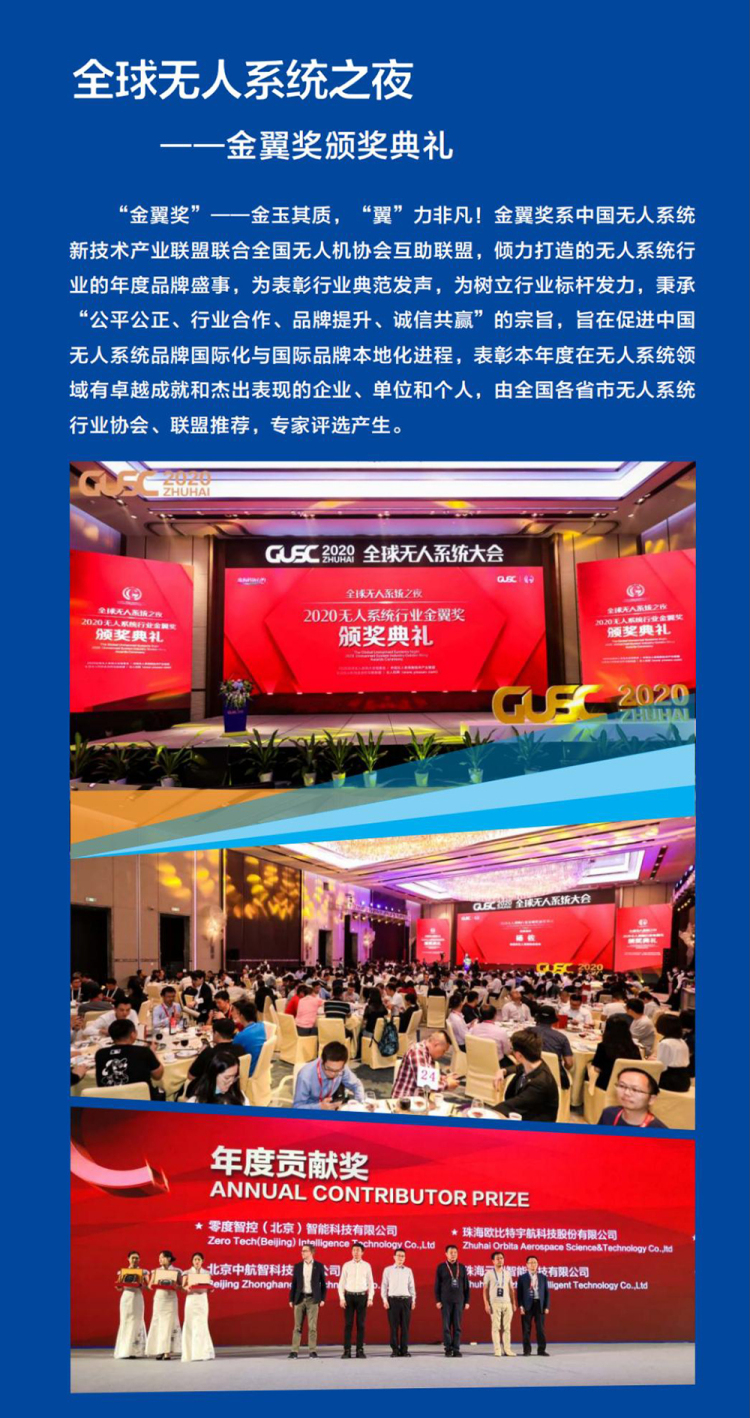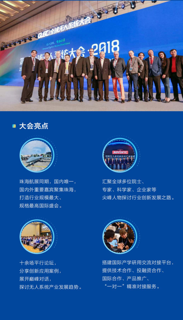 中国珠海无人机、无人系统展(GUSC)由中国无人机产业联盟、广东省科学院、珠海市无人机协会联合主办。大会得到了国家体育总局航管中心,全国无人机协会互助联盟,国际无人机系统标准化协会,美国国际无人系统协会等来自世界各地30多家无人系统权威机构的鼎力支持。大会邀请了中国工程院陈志杰院士、樊邦奎院士、陈清泉院士、樊会涛院士、欧洲科学院陈俊龙院士、法国欧洲科学院兰玉彬院士、深圳市无人机行业协会杨金才会长作为大会顾问和演讲嘉宾。