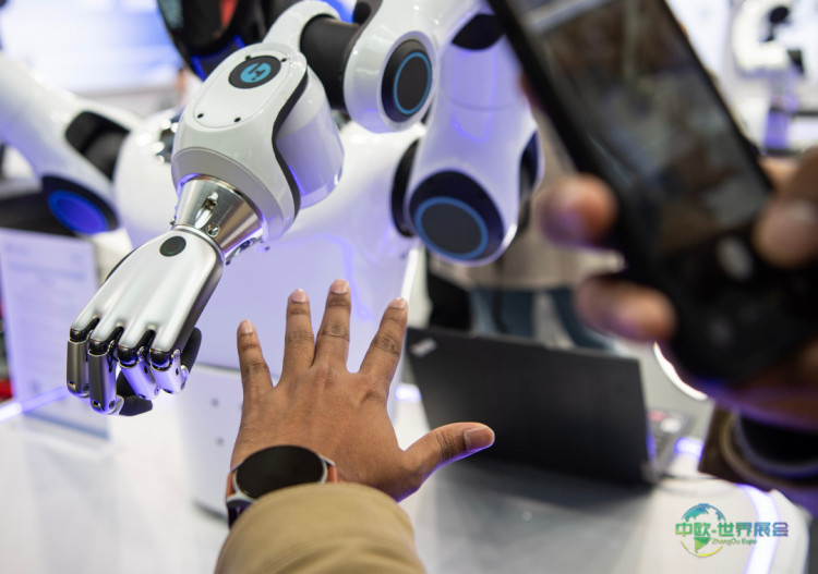 4月21日,在德国汉诺威工业博览会上,一名男子正在对比人类的手与机器人的机械手。新华社记者 张豪夫 摄