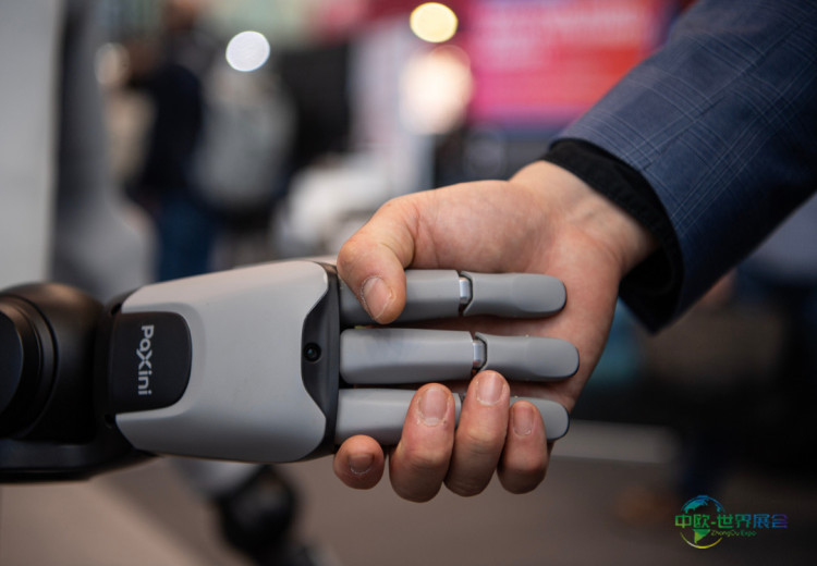 4月21日,在德国汉诺威工业博览会上,一名男士正在与一款帕西尼人形机器人进行握手互动。新华社记者 张豪夫 摄