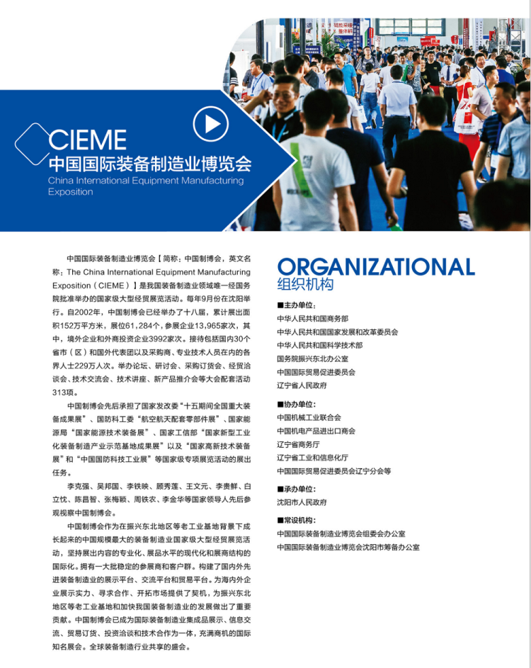 中国沈阳国际装备制造业展-沈阳制博会(CIEME)是东北地区最大规模、最权威的装备制造业展览会。在行业中已经形成了品牌优势,每年吸引来自国内外的客商多万人次,展示各类高中端设备数万台(套)。